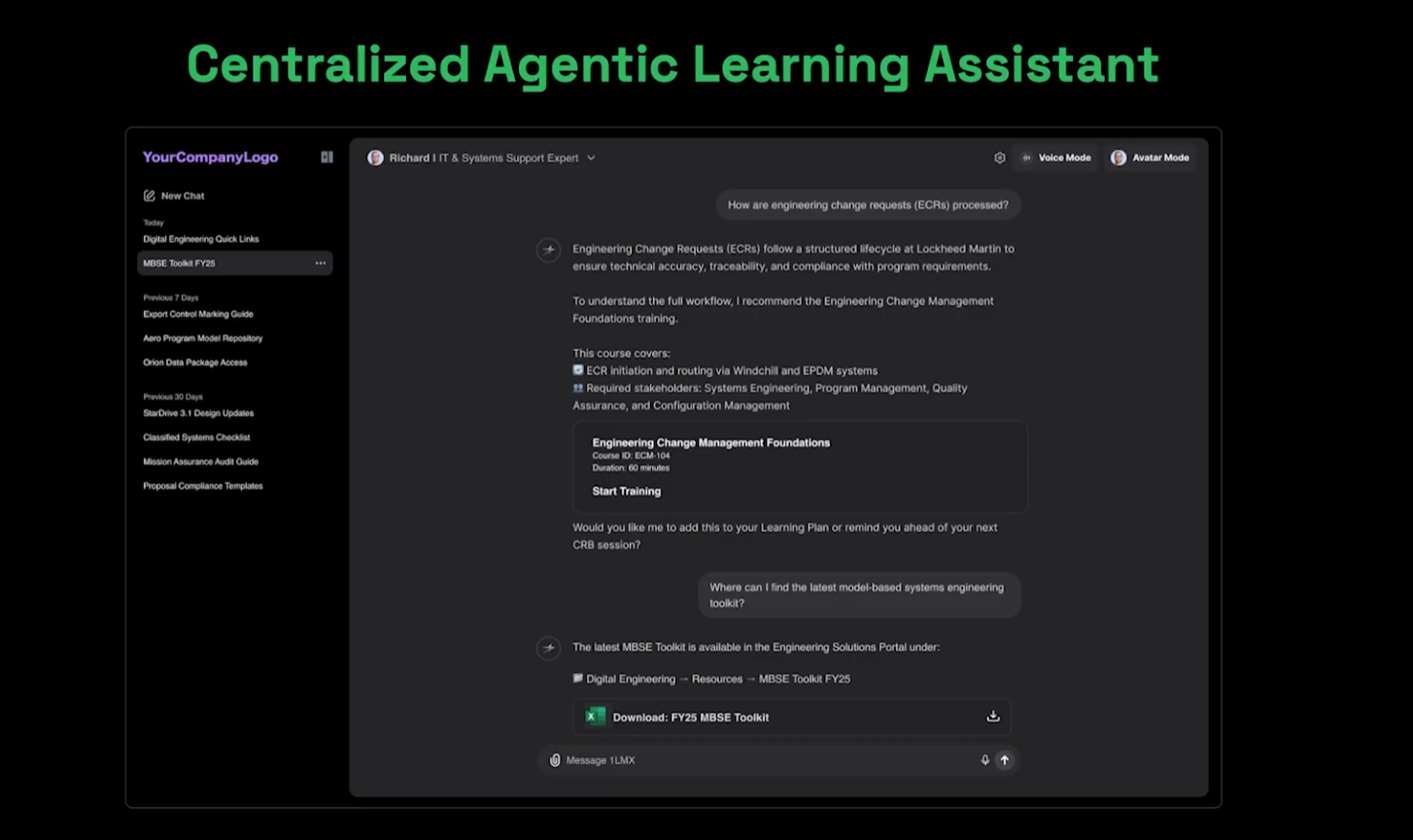 A secure, internal assistant specialized for L&D workflows. It performs agentic research, retrieves answers from your systems, and recommends content or practice paths—hosted on cloud, or on-prem.