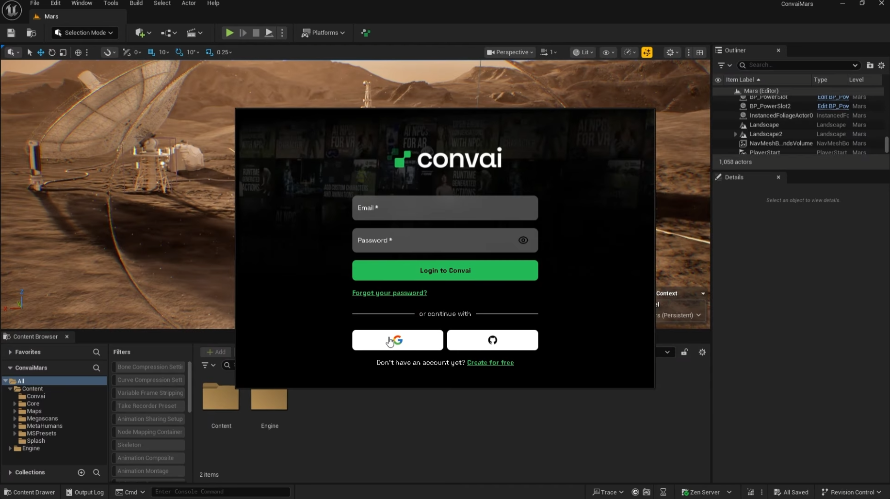 2. Once authenticated, you’ll see the Convai dashboard inside the editor.